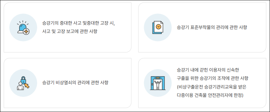 - 제1항: 승강기 관리주체는 승강기 운행에 대한 지식과 경험있는 사람을 안전관리자로 선임하여 승강기를 관리해야함