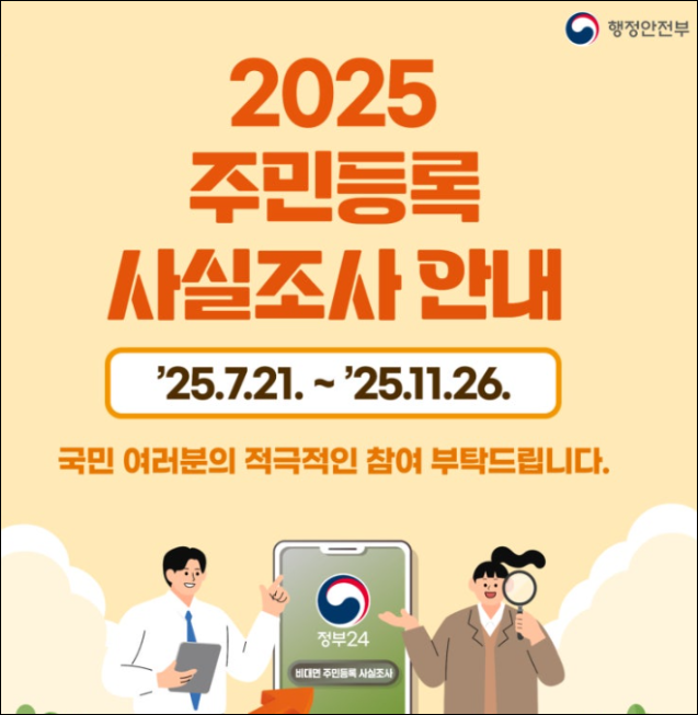 주민등록 제도는 국민의 신분과 거주지를 공식적으로 확인하는 국가의 중요한 행정 시스템입니다. 정부는 이를 통해 행정 효율성을 높이고, 복지, 교육, 선거, 국방 등 다양한 공공 정책의 기초 데이터를 확보합니다. 이에 따라 행정안전부와 전국 지방자치단체는 매년 정기적으로 '주민등록 사실조사'를 실시하여 주민등록 정보의 정확성을 점검하고 있습니다. 이 글에서는 2025년 주민등록 사실조사의 개요부터 비대면 참여 방법, 그리고 조사 불응 시의 불이익까지 실질적으로 필요한 모든 정보를 정리했습니다.