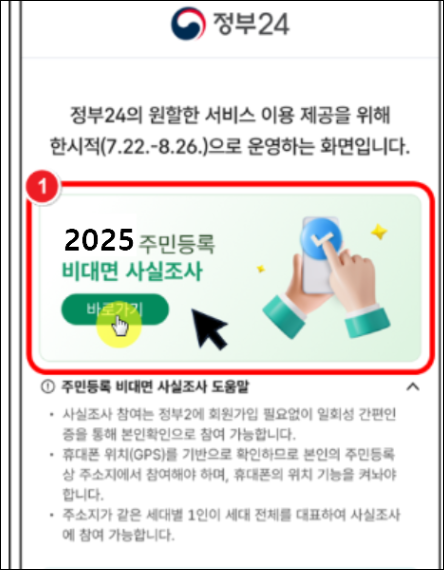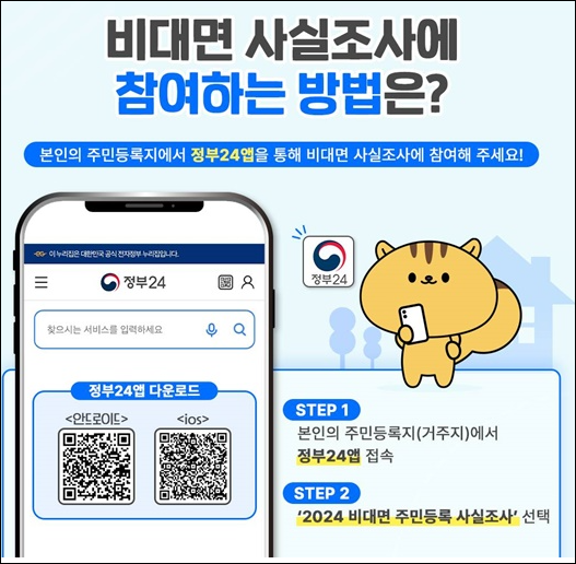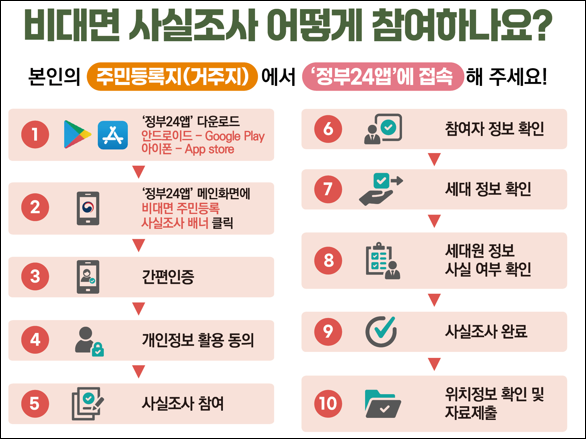 정부24 웹사이트나 앱에서 '주민등록 사실조사' 메뉴에 접속한 뒤 본인 인증을 하고 세대원 정보를 입력해 제출하면 됩니다. 2025년 비대면 참여 기간은 7월 21일부터 8월 31일까지입니다.
