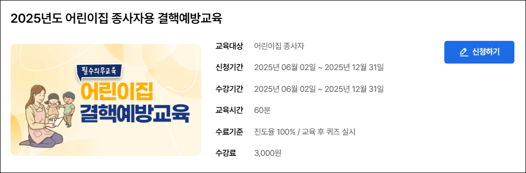 | 어린이집 종사자 | 2025년도 어린이집 종사자용 결핵예방교육 | 2025-06-02 ~ 2025-12-31 |