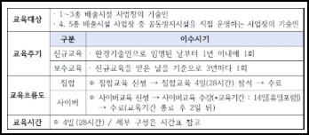 - 신규교육: 환경기술인으로 임명된 날부터 1년 이내에 반드시 이수해야 합니다.
