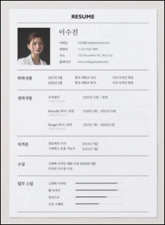 • 특징: 디자인 중심의 이력서 템플릿 제공 (시각직군에 적합)