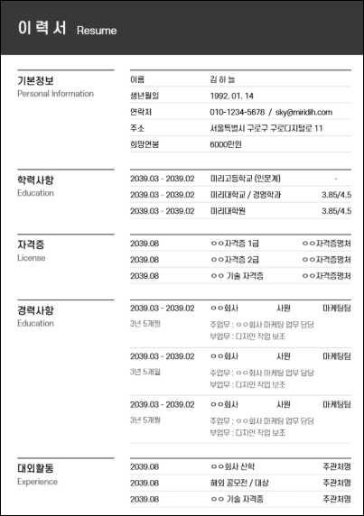 → 미리캔버스나 Canva에서 무료 템플릿을 이용하면 시각적으로 세련된 이력서를 제작할 수 있습니다.