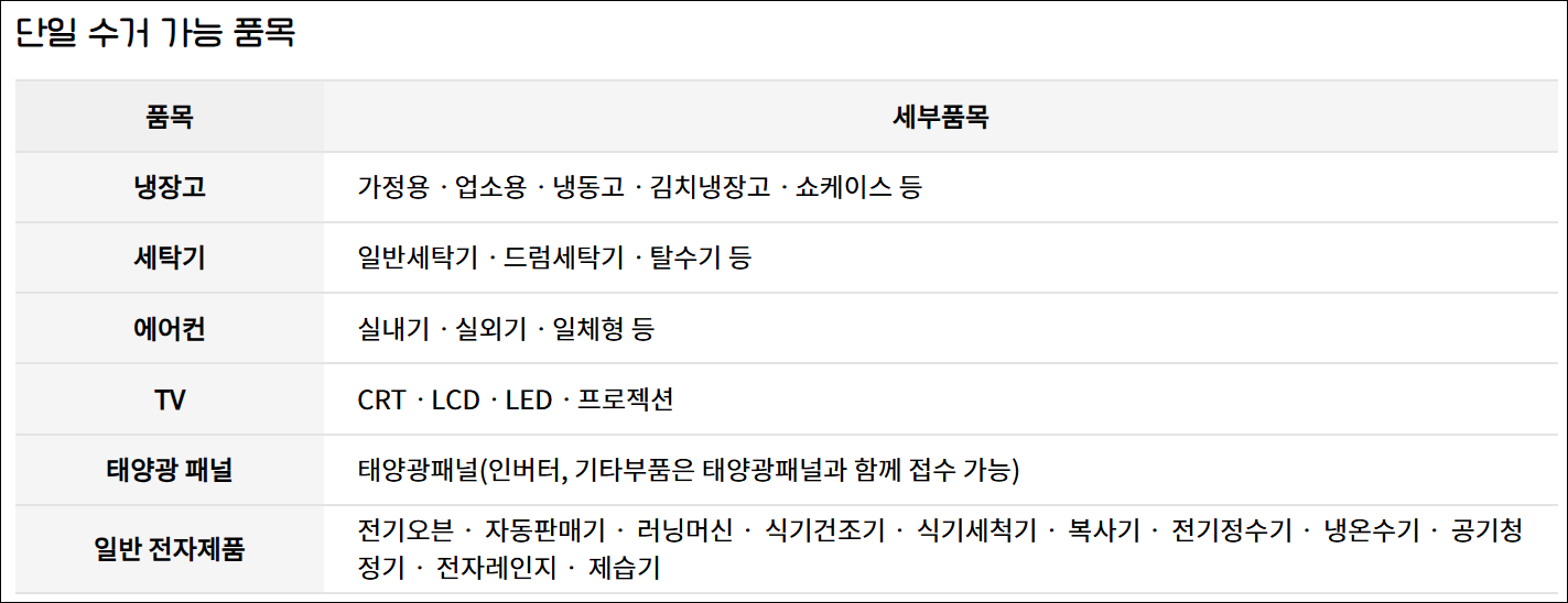 | 필수 대형가전 | 냉장고(가정용·업소용·김치냉장고 등), 세탁기(드럼형, 통돌이 등), 에어컨(실내기/실외기/일체형), TV(CRT, LCD, LED 등) |