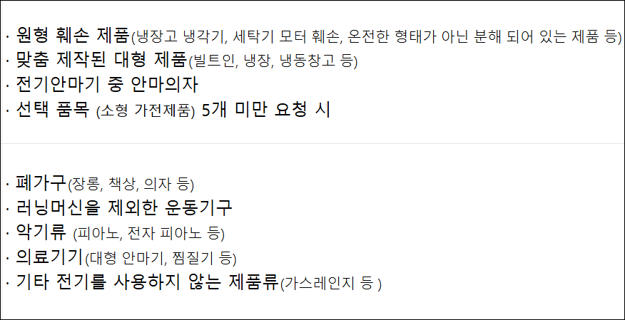 | 운동기구 및 악기류 | 러닝머신(일부 제외), 피아노, 전자피아노 등은 가전제품 분류에서 제외되어 별도 처리 대상이 됩니다. |