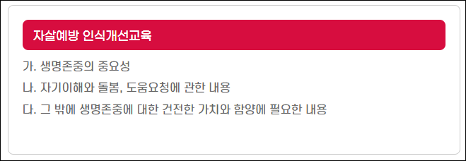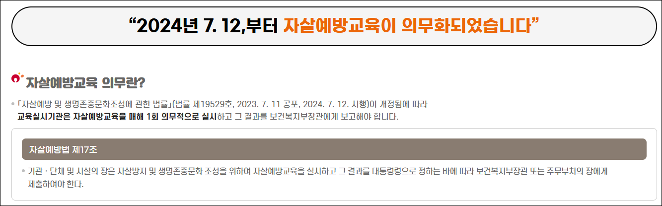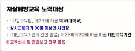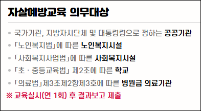 의무 대상: 다음 기관 및 시설은 연 1회 이상 ‘자살예방교육’을 실시