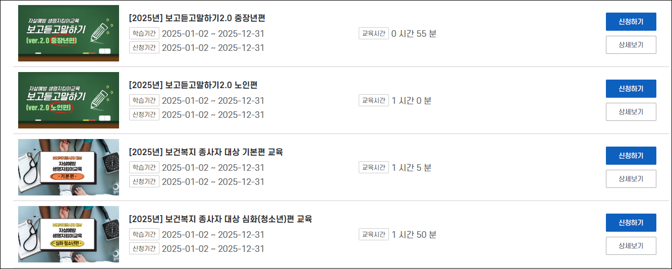 일반 시민 및 생애주기별(청소년, 청년, 중장년, 노인) 120분(기본형) / 45-60분(생애주기형) · 온라인 및 대면 병행  자살 암시 신호(보기) → 죽음·삶 경청(듣기) → 안전점검 및 도움 요청(말하기)