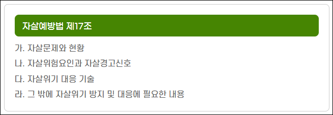 | 의무 대상: 다음 기관 및 시설은 연 1회 이상 ‘자살예방교육’을 실시 |