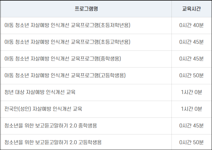 | 교육의 사회적 확산 효과 | 반복적 교육을 통해 사회 전반의 생명존중 가치관을 강화하고, 자살예방 인식 개선에 기여함. | 지역사회 캠페인, 지방자치단체 협력 |
