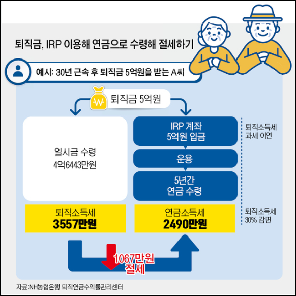 - IRP 계좌로 직접 퇴직금을 수령하면 퇴직소득세가 과세이연됩니다.