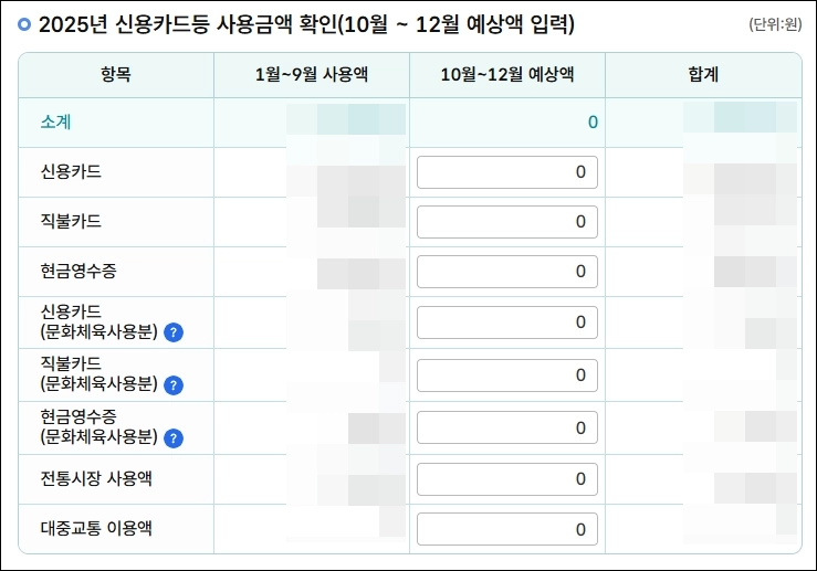 - 카드 사용액이 자동 반영된 이후 남은 달(10~12월)에 예상 사용액을 추가로 입력하였는가?