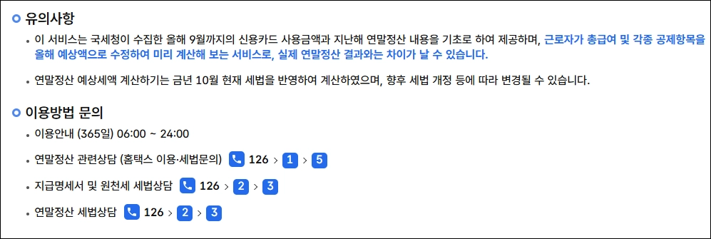 - 계산된 금액은 예상치이므로 실제 연말정산 결과와 차이가 있을 수 있습니다.
