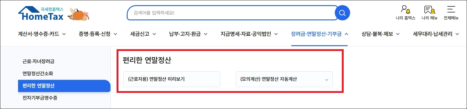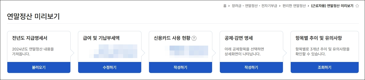 - 메뉴에서 전체메뉴 > 장려금·연말정산·기부금 > 편리한 연말정산 > (근로자용) 연말정산 미리보기로 이동합니다.