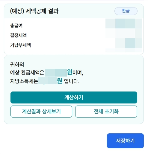 - ‘예상세액 계산하기’ 버튼을 눌러 예상 환급액 또는 예상 추가납부액을 확인합니다.