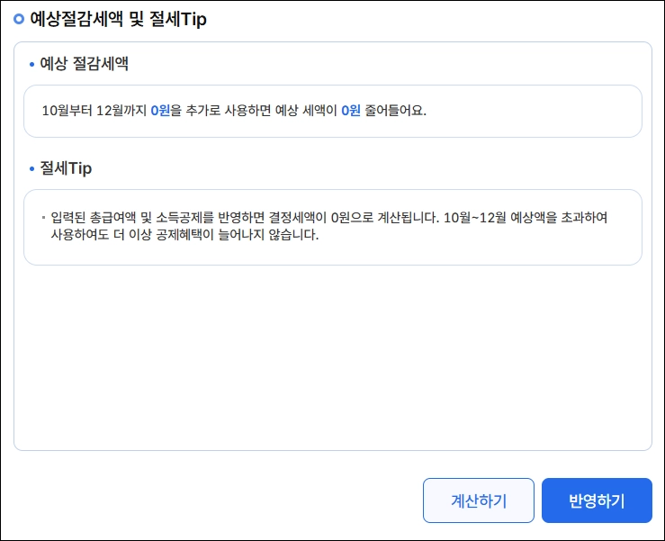 - 계산된 금액은 예상치이므로 실제 연말정산 결과와 차이가 있을 수 있습니다.