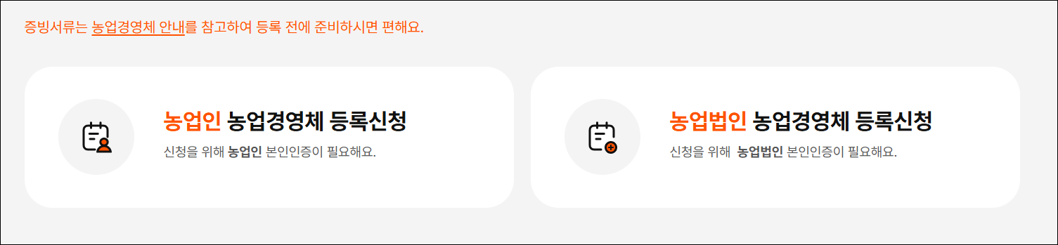 개인 농업인 농업경영체 등록 완료 실제 경작 중인 농지를 기준으로 농업경영체에 등록되어 있어야 하며,