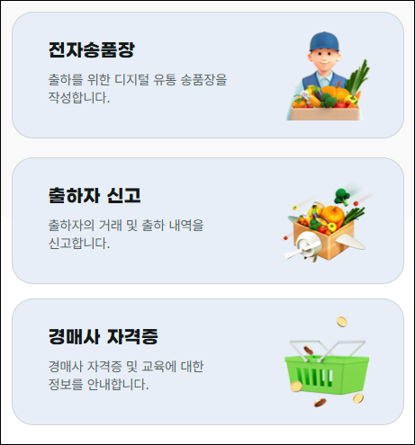 도매시장 통합홈페이지는 단순 정보 열람용 웹사이트가 아니라, 실제 도매시장 거래 흐름을 디지털 환경으로 그대로 이전한 통합 유통 플랫폼입니다. 경매 정보, 통계 데이터, 전자 행정 시스템, 정책 안내까지 하나의 체계로 연결되어 있으며, 각 서비스는 독립적으로 작동하면서도 상호 연계 구조를 갖추고 있습니다.