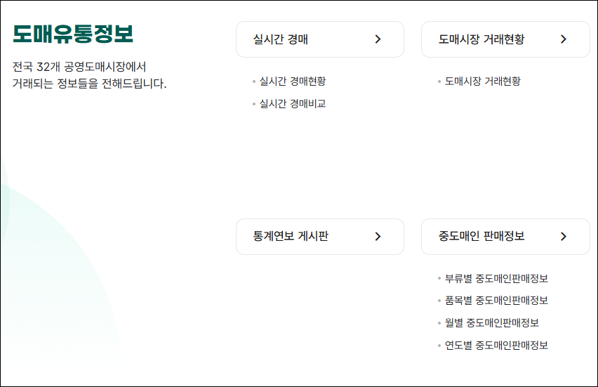 - 전국 32개 공영 도매시장 경매 결과 실시간 조회