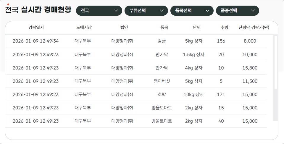 각 도매시장에서 발생한 실제 경락 데이터를 기반으로 제공되며, 일정 시간 간격으로 업데이트됩니다.