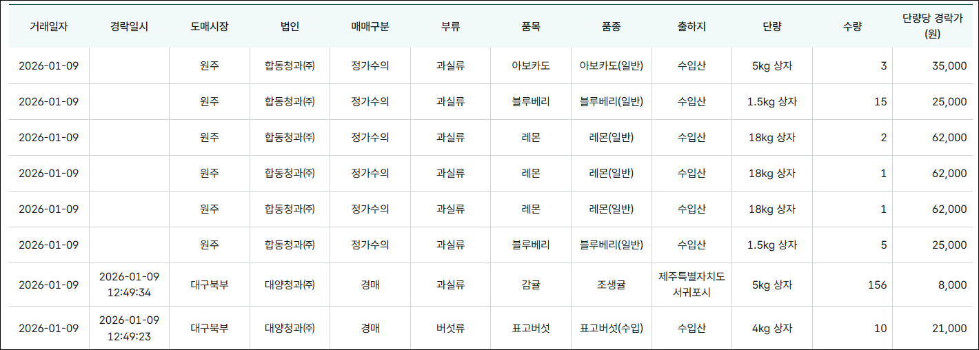 각 도매시장에서 발생한 실제 경락 데이터를 기반으로 제공되며, 일정 시간 간격으로 업데이트됩니다.