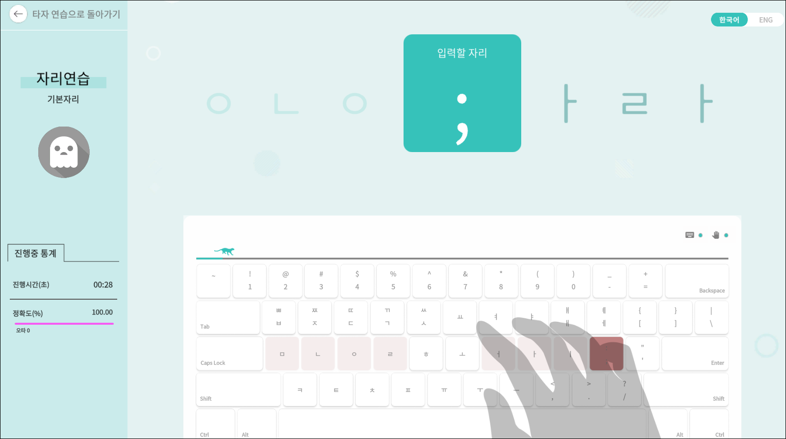 - 자리연습 메뉴에서 양손 검지 손가락이 F·J(영문 기준)에 위치하도록 습관화.
