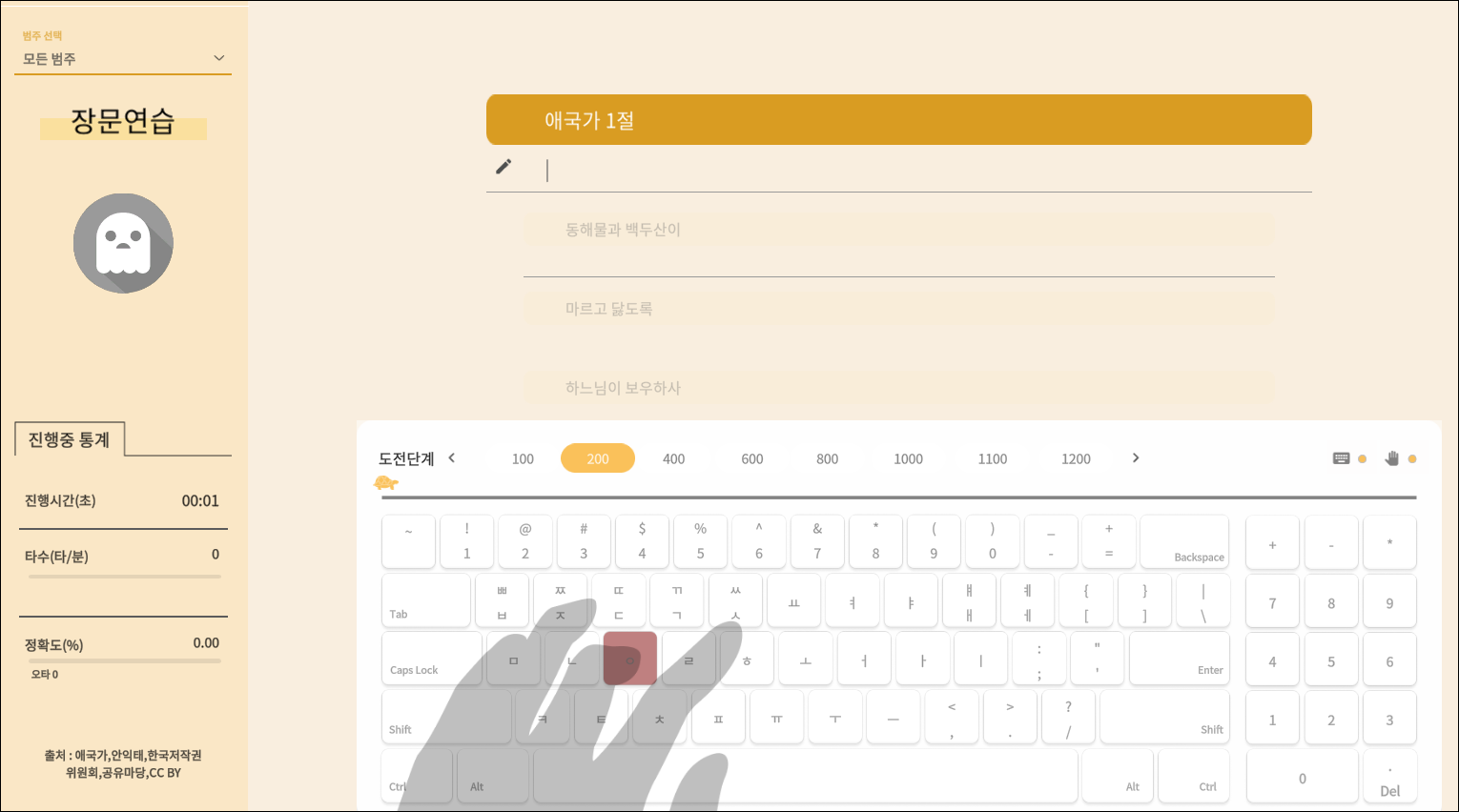 - 단문연습: 짧은 문장을 입력하며 속도와 리듬을 익히는 단계입니다.