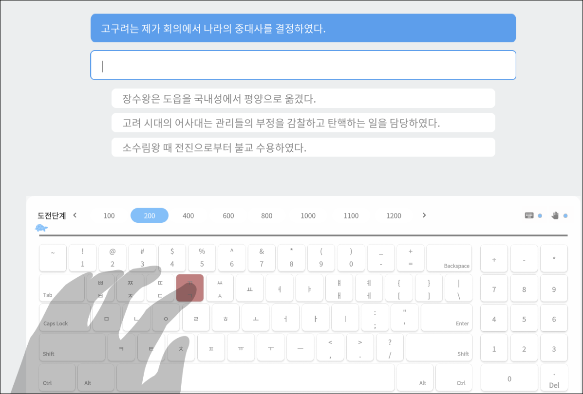 - 낱말연습(단어 연습): 자모 조합에 익숙해졌다 하더라도, 실제 단어를 치는 과정에서 자주 틀리는 부분을 교정합니다.