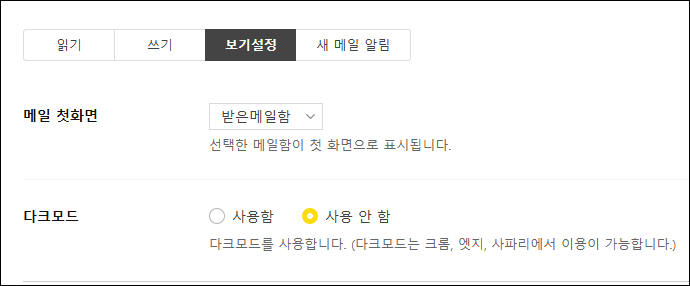 한메일 기본 설정 메뉴