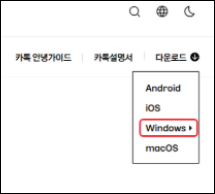 https://www.kakaocorp.com/page/service/service/KakaoTalk - 운영체제(Windows/macOS) 선택 후 ‘다운로드’ 버튼 클릭