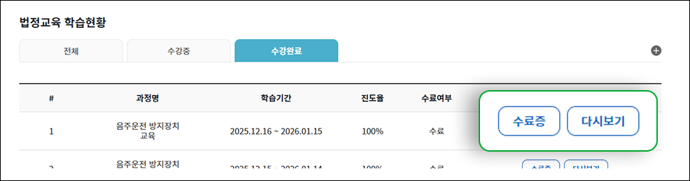 - 진도율 100% 및 평가 기준 충족 시 자동 수료