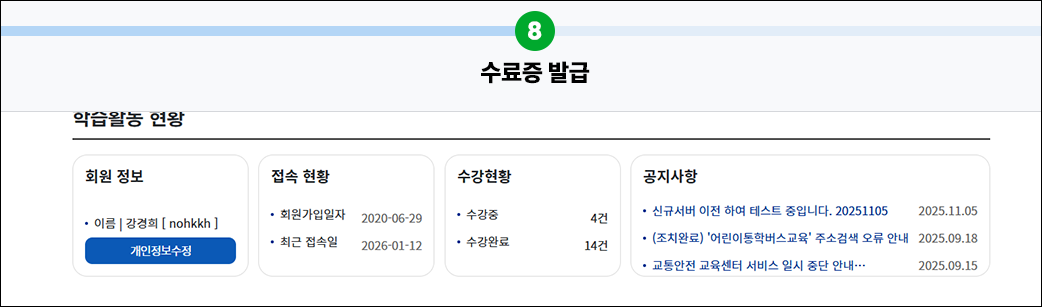 마이페이지에서 수강 이력 및 수료증을 확인하실 수 있습니다.
