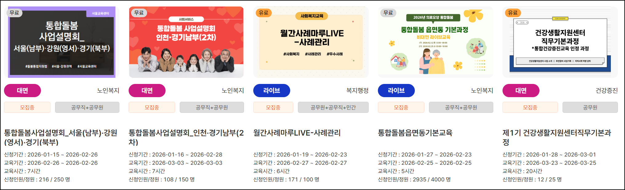 | 1 | 사회복지사 보수교육 | 사회복지사 | 현장 사례 중심, 최신 복지정책 반영 |