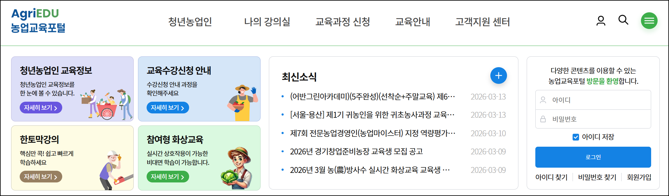 농업 교육포털 교육을 수강하기 위해서는 먼저 사이트 접속과 회원가입이 필요합니다.