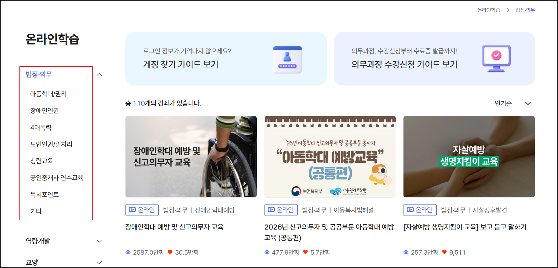 - STEP 2. 왼쪽 분류 메뉴에서 [법정·의무교육] 탭 선택