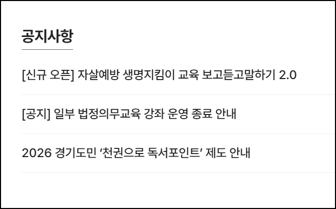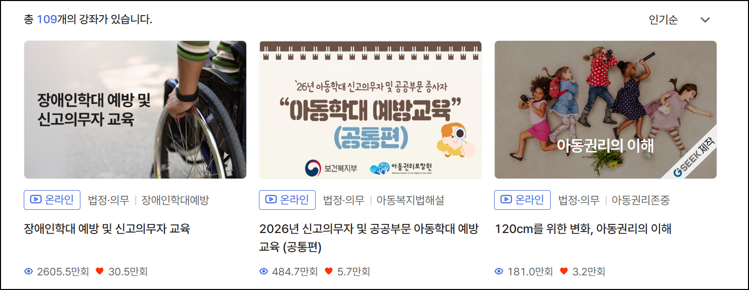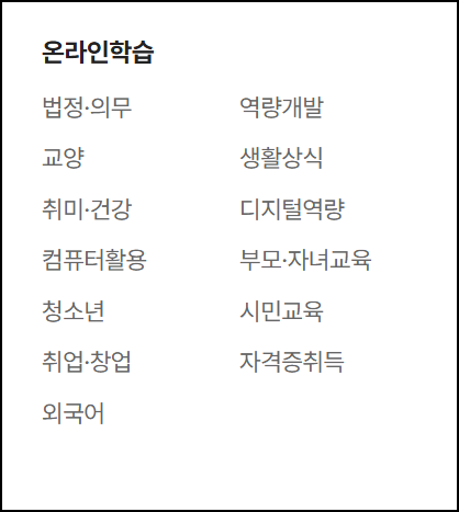 | 법정·의무교육 | 성희롱 예방, 개인정보보호, 아동학대 예방, 인신매매방지법, 장애인 인식개선 등 |