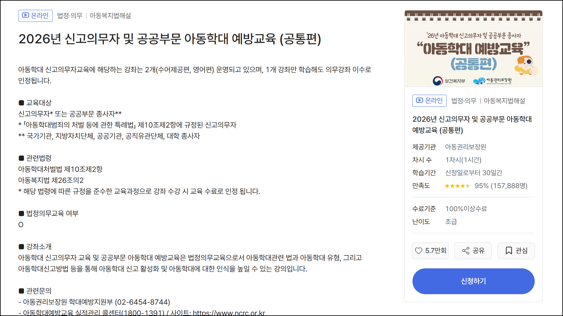 별로 해당 법령이 다르므로, 수강 전 강좌 설명에서 관련 법령과 교육 대상을 반드시 확인하시기 바랍니다.