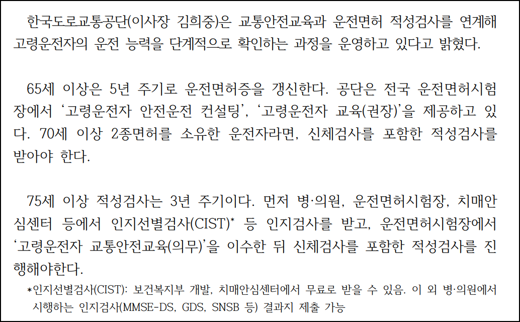 | 인지능력 자가진단 | MMSE-DS 등 인지능력 자가진단 검사 및 결과에 따른 안전운전 요령 |