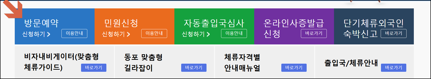회원가입 없이 여권번호로 간편하게 예약할 수 있습니다. 먼저, 한가지 주의사항으로 방문예약 신청은 민원처리 접수가 아닌 방문일자 예약 행위입니다. 당일 실제 접수는 출입국사무소 창구에서 이루어집니다.