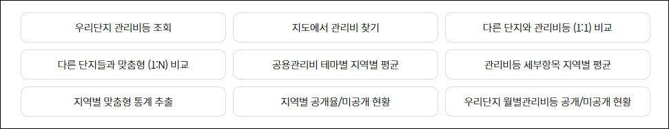 | 관리비 정보 | 세부 항목별 관리비 확인 | 경비, 청소, 승강기, 일반관리비 등 항목별 상세 확인 |
