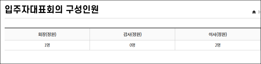 | 관리주체 | 입주자대표회의 구성 및 교육이수 여부 | 대표자, 관리책임자의 이력 정보 제공 |