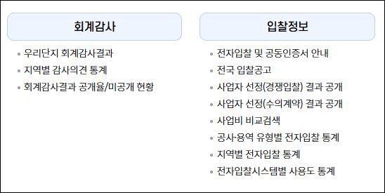 | 계약 정보 | 공사·용역 계약 내역 공개 | 낙찰 업체, 계약금액, 계약 방식 확인 |