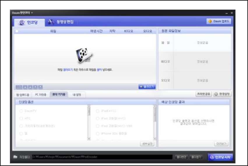 - STEP 1 다음팟인코더 실행 → 중앙 화면에서 [불러오기] 클릭 또는 변환할 파일을 마우스로 끌어다 놓기(드래그 앤 드롭)
