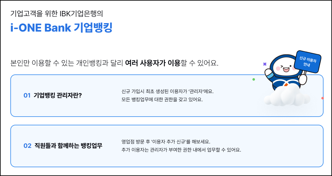 기업인터넷뱅킹(kiup.ibk.co.kr)과 개인인터넷뱅킹(mybank.ibk.co.kr)은 별도 사이트입니다. 법인·사업자 업무는 반드시 기업인터넷뱅킹 주소로 접속하시기 바랍니다.