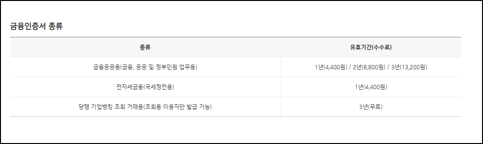 | 범용인증서 비용 | 개인 4,400원 / 기업 110,000원 | - |