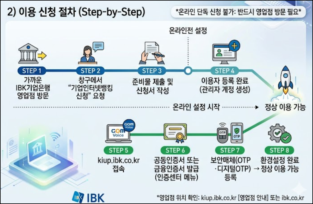 처음 이용 신청은 반드시 가까운 IBK기업은행 영업점을 방문해야 합니다. 신분증과 거래통장(또는 현금카드)을 지참하여 창구에서 신청하면 됩니다. 영업점 신청 완료 후 인증서 발급부터는 온라인으로 진행됩니다.