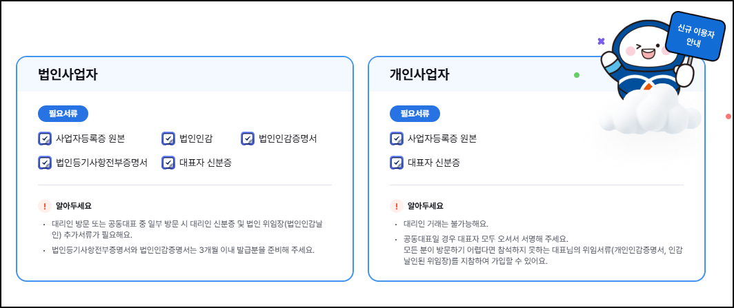 | 개인사업자 | 신분증, 거래통장 또는 현금카드, 사업자등록증 |