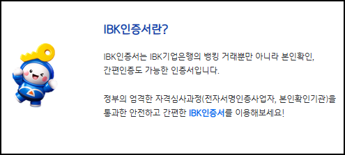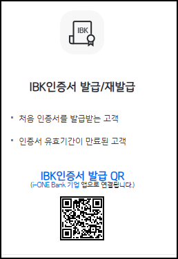 kiup.ibk.co.kr 접속 → 상단 [인증센터] 클릭 → [인증서 발급/재발급] 선택 → 인증서 종류 선택 →
