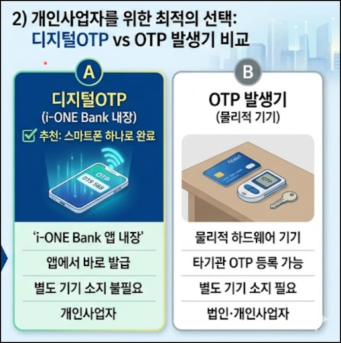 | 형태 | 물리적 하드웨어 기기 | i-ONE Bank 기업 앱 내장 |