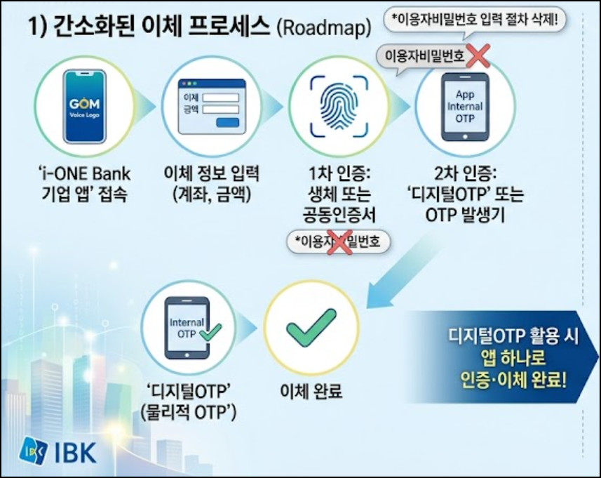 디지털OTP를 활용하면 별도 OTP 발생기 없이 i-ONE Bank 기업 앱 하나로 인증과 이체를 모두 처리할 수 있습니다.