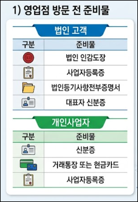 | 법인 고객 | 법인 인감도장, 사업자등록증, 법인등기사항전부증명서, 대표자 신분증 |